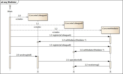 2.ConcreteMeditor:具体中介者。它需要了解并维护各个同事对象,并负责具体的协调各同事对象的交互关系。