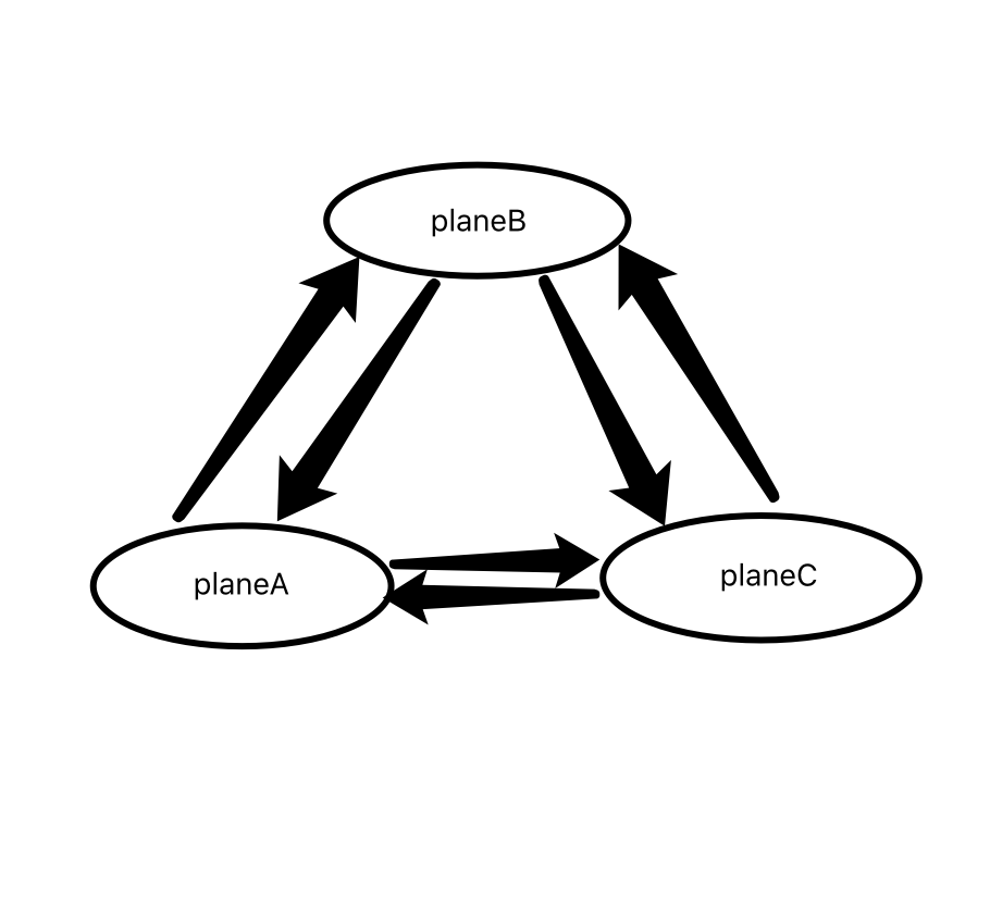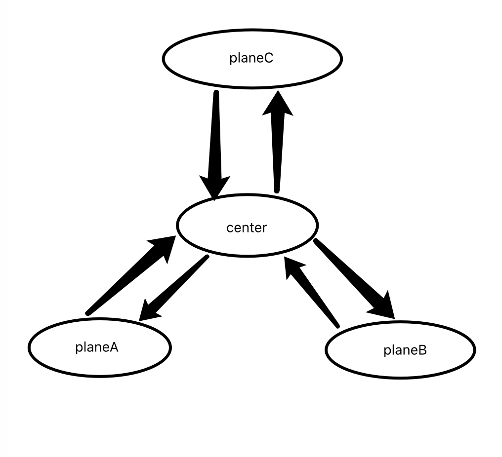 机场有很多的飞机,每个飞机都要起飞和降落,为了保证能够安全的起飞和降落,飞机之间就需要进行通信,来报告自己的位置的变化。他们之间的通信如下图所示: