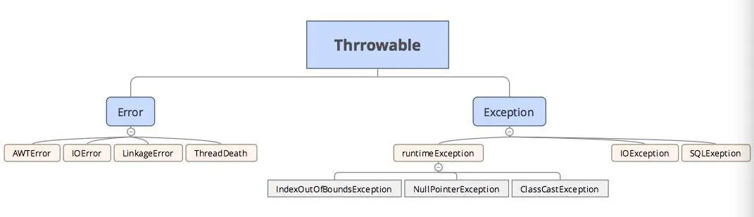 Exception是由JVM发出的异常, 他的异常类型包括两种, 一种是RuntimeException, 另外一种是Checked Exception异常或者说是(记成)非RuntimeException类型的异常也可.