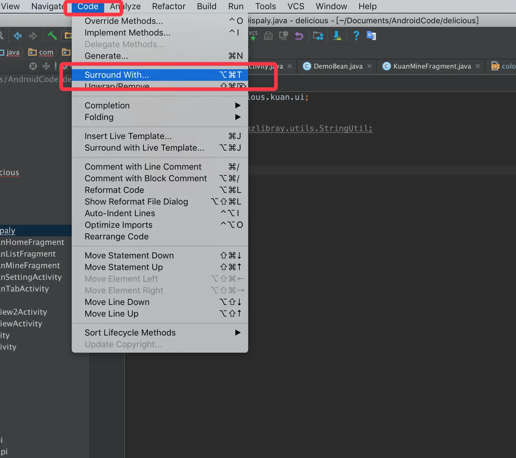 环绕的使用方式是选中要被环绕的代码段,然后Surround With(最好使用各自平台的快捷键),这个功能也会有很多系统提供的环绕模板。