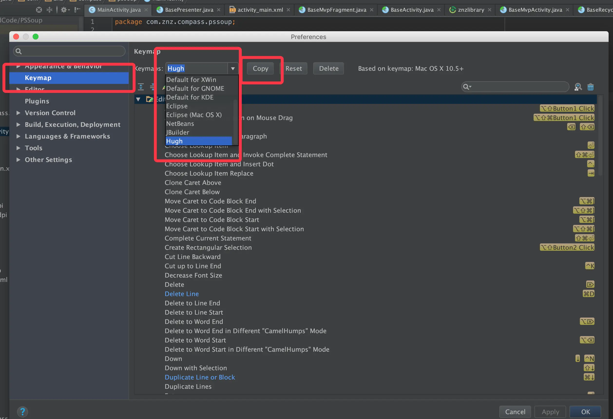 找到设置中的keymap,选择一个常用的,比如Eclipse(Mac OS X)点击copy,然后就可以开始修改快捷键了。