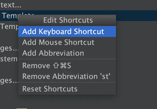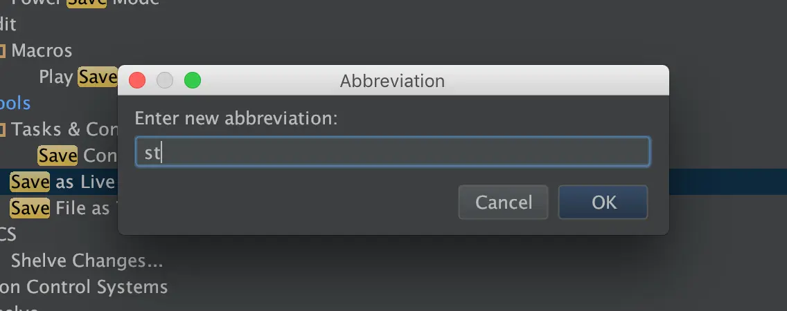 还是刚才的Save as Live Template,如果不设置缩写,我在搜索的时候需要搜索Save as Live Template,但是如果设置了它缩写为st,直接搜索st即可: