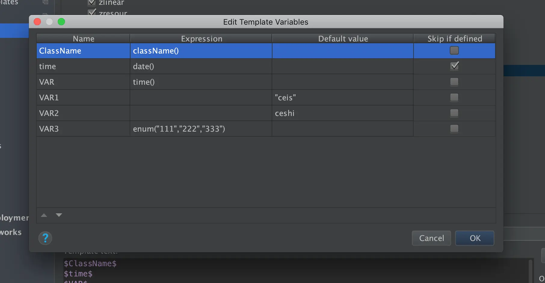 gif图中的使用效果已经看见了,但是里面设置的$VAR1$,$END$是什么意思呢?这些是设置模板时的参数,设置后使用模板的时候光标会停在对应的参数位置,按下tab或者enter后会跳转到下一个光标处。不管是java代码中,还是xml中都可以设置模板。