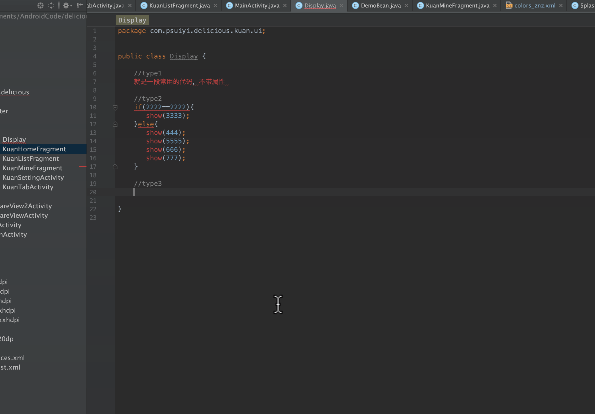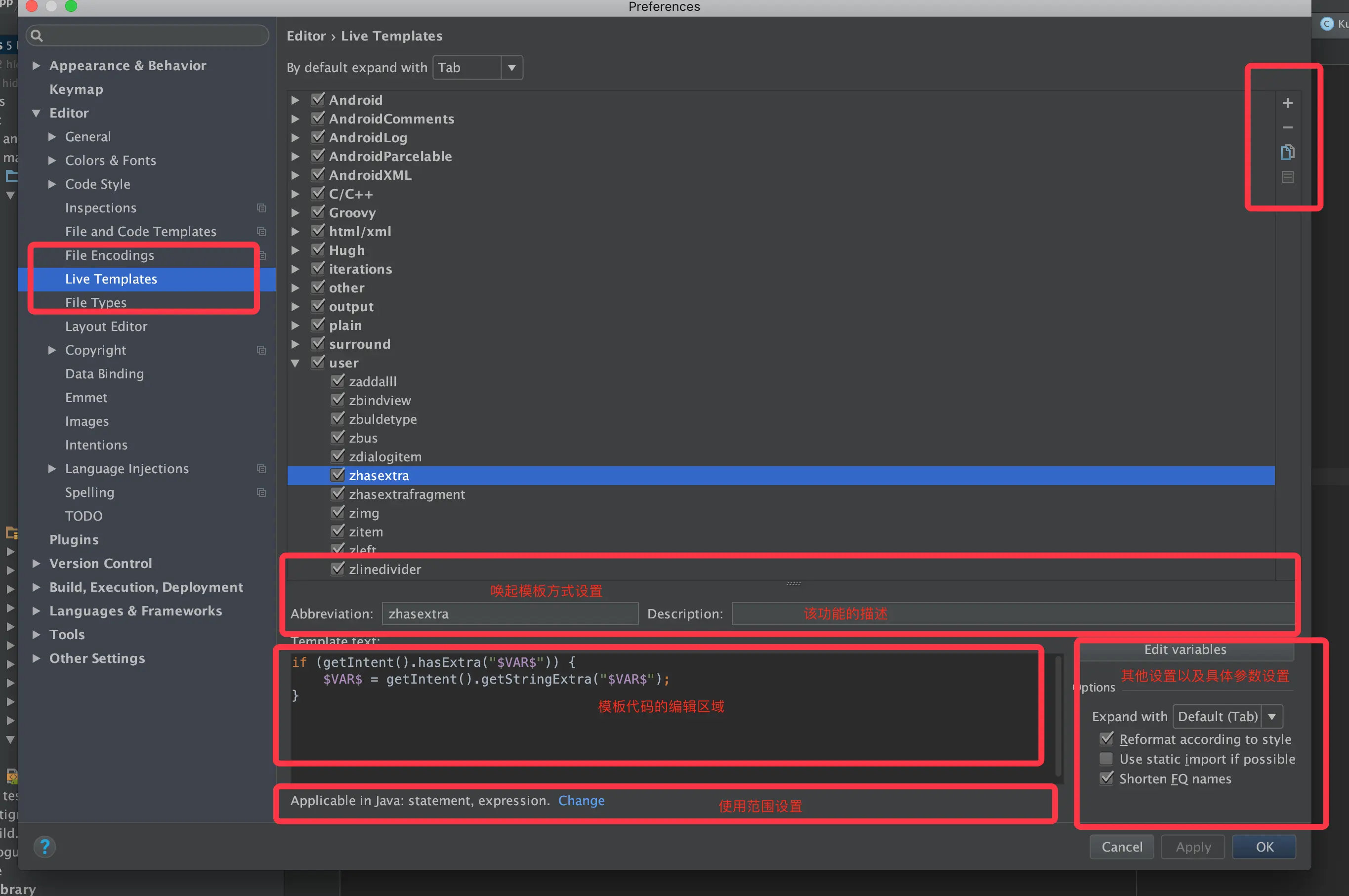 注意点:强烈建议所有的缩写都以一个相同的字母开始,比如zdialog,zitem,zli,ztoast。这样的好处是当你想用模板的时候只要按下z就会集中显示你设置过的模板,否则这些缩写会和系统的各种缩写混在一起很难找并且记忆。同理,我理解的代码规范里面设置变量时需要以m开头也是这个道理。