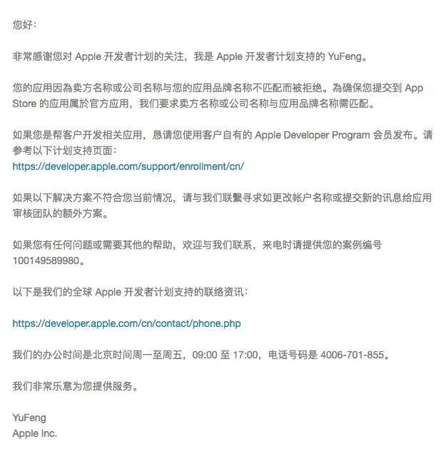 同时,拨打了中国开发者支持电话:4006 701 855,对方说给我一封邮件,照做即可。结果收到了和废话一样的如下邮件: