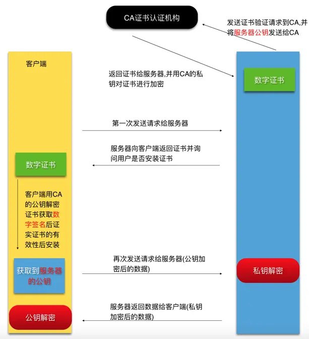 简单说来, 就是在客户端和服务器之间建立一个安全通道, 建立通道的机制就是公钥和私钥, 但是服务器如何将公钥传给客户端呢? 如何保证公钥在传输的过程中不会被拦截呢? 这就需要CA颁发数字证书了.