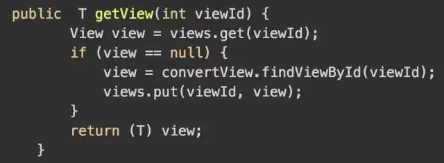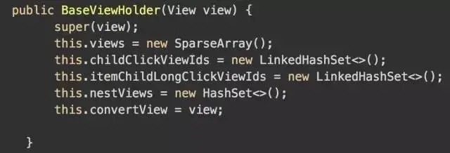 如果view==null 我们会通过convertView去调用我们再熟悉不过的findViewById进行创建,然后把创建的view实例缓存到views中方便下次使用,上面我们说到convertView是viewholder的ItemView,也就是每个item的总布局。其实是在初始化BaseViewHolder的时候传进来的