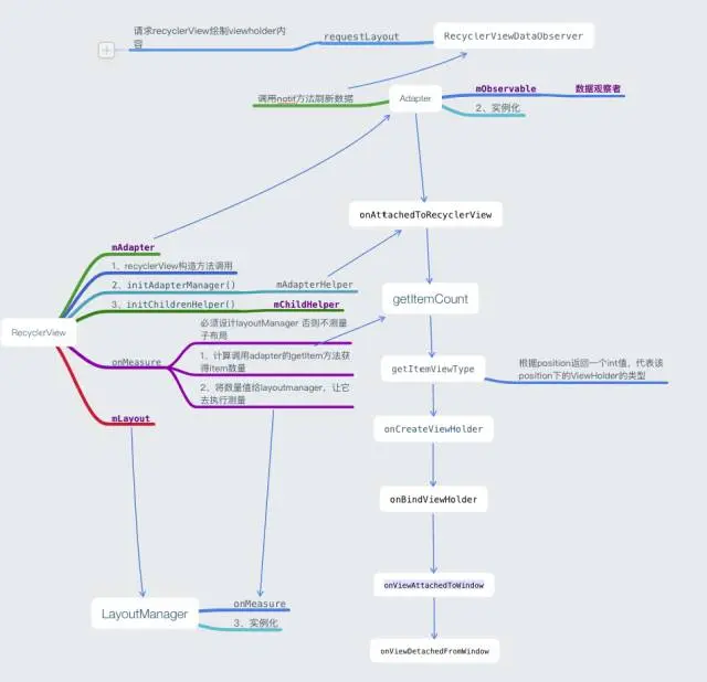 我们来一起分析BaseRecyclerViewAdapterHelper中有关BaseQuickAdapter的源码,今天的分析思路是根据BaseQuickAdapter的实例化过程来进行分析。分析前我先分享一个RecyclerView.Adapter的生命周期方法图:
