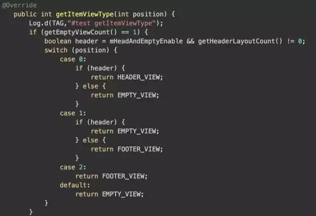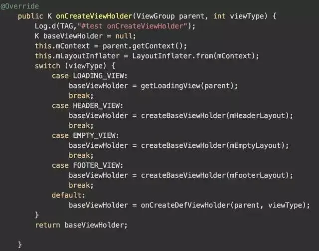 从代码可以看到,他是根据我们data的index值以及我们是否开启空视图之类的数据来决定在onCreateViewHolder中应该返回什么类型的viewHolder。