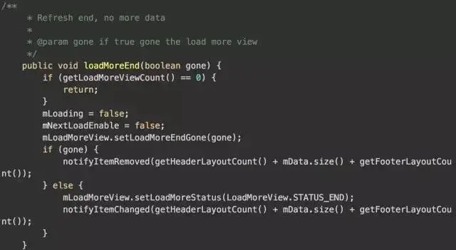 很好理解,我们的loadMoreView是一直存在的。作为我们recyclerView的最后一个item,当加载到最后一个item的时候,他就调用loadView的convert方法,方法内部根据我们当前是否应该显示loadView来做相应的操作。这样我们就理解了loadMore的隐藏和显示的逻辑了。后面还有两个方法也很好理解,请看。