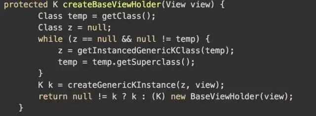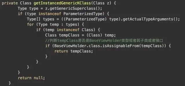 该方法最终会判断当前的类是否是BaseViewHolder的子类或者接口,如果是返回,不是返回null。经过下面的三目运算
