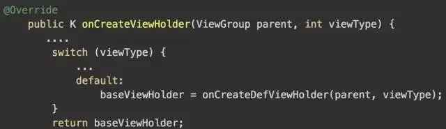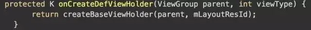 但是,在上面的代码中我们并没有看到有使用我们的 mLayoutResId 资源id的代码。我们可以看到,switch里面前几个都是创建空视图啊,头部视图,底部视图之类的。default这个onCreateDefViewHolder估计是我们需要找的代码,我们来看下这个方法: