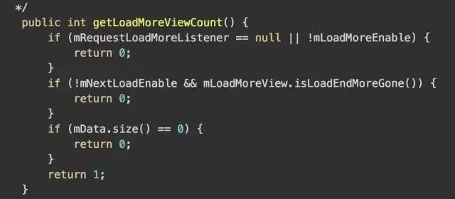 第一句先判断getLoadMoreViewCount判断是否==0.其实他并不是简单的判断是是否有加载更多视图的数量。进入方法里: