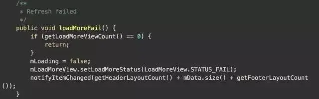 加载失败调用,可能你有需求在加载失败后要显示一个加载失败的view提示用户,而不是直接关闭loadMoreView。此时你可以调用该方法。
