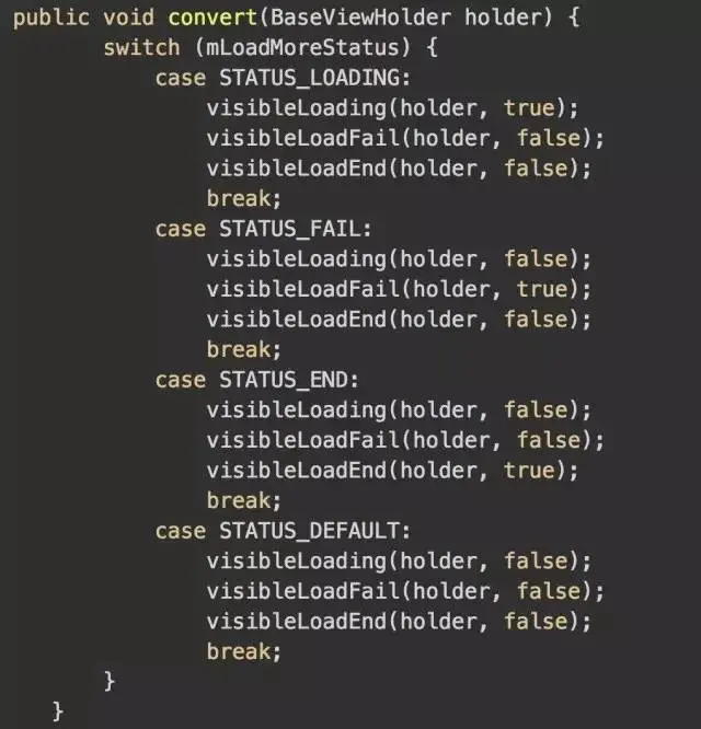 他是在一个convert方法中根据mLoadMoreStatus来改变loadMoreView的显示和隐藏,convert方法大家应该很熟悉,参数holder其实就是我们的loadMoreView本身,那么loadMoreView.convert在哪被调用呢。