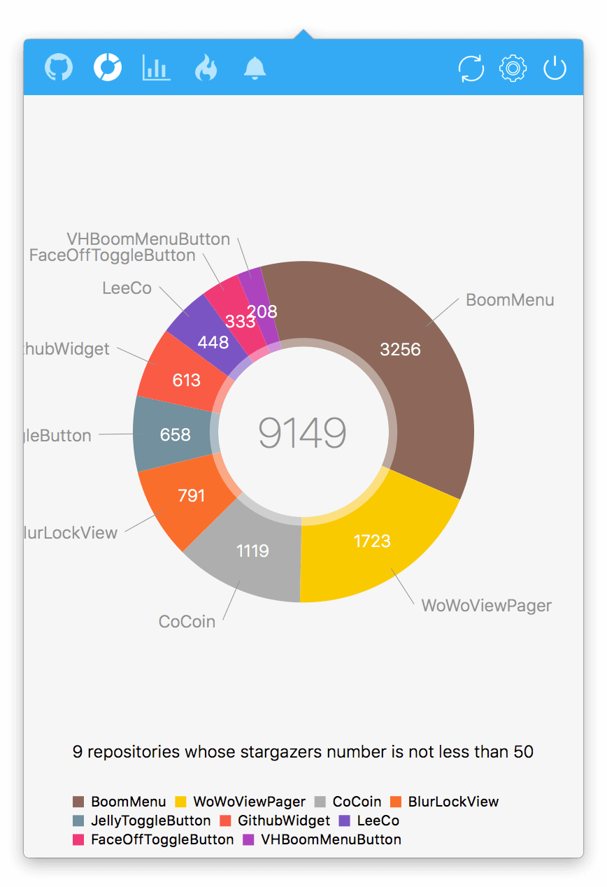 - A pie charts which shows the starzagers of your repositories. You can adjust the least minimum starzagers number in settings. Try to choose repository to open its homepage in browser.