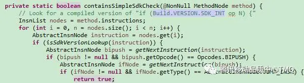 然后开始对类节点的扫描处理,同样判断方法前是否有TargetApi标注定义了局部miniSdk,依次检查类中method、field、LDC引用值,源码中可以看到在method、field的调用判断中,也对android常用的版本判断格式if(Build.VERSION.SDK_INT >= XX)的分支进行判断检查