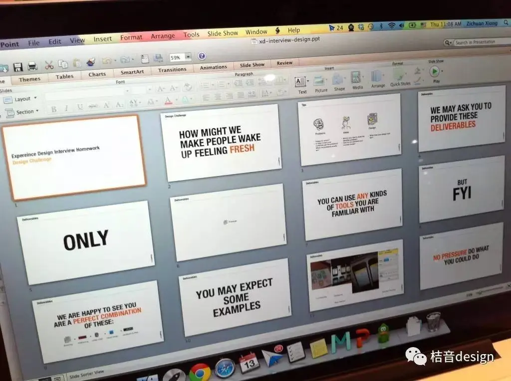 在最开始,如果我们觉得你的简历不错,我是说,一个能表达你设计能力的简历——在我们看来一份充分通过信息设计的简历是第一个令我们眼前一亮的东西;我们会发给你一个作业,在这个作业里包含了一个设计挑战,你被要求用任何你熟悉的方法去接受这个设计挑战。
