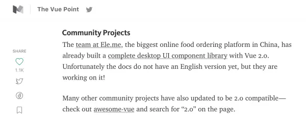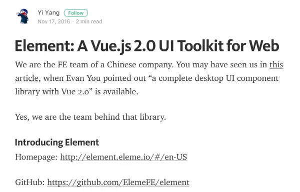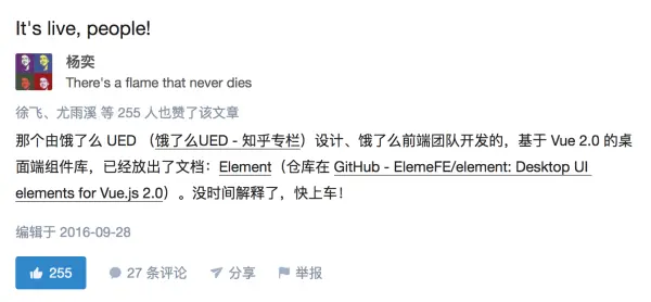 2016 年 10 月 1 日,Vue.js 2.0 正式发布。尤小右在发布声明里特别提到了 Element。