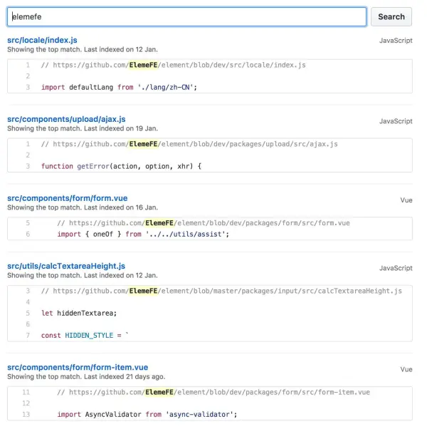 在 2016 年 11 月 7 日,iView 发布第一篇推广文Vue高效UI组件库-iView开发实践 - 知乎专栏,这里提到了对 Element 的学习,但是我们却注意到 iView 有复制 Element 的代码。比如日期选择器(DatePicker)组件的神还原,之后的还有多语言、表单校验功能的大肆抄袭,部分代码作者有注明出处,还有一些并没有(下图为在 iView 仓库搜索「elemefe」的结果)。可笑的是,作者四处宣传自己的设计多优良,不提 Element 也罢,多个场合公然出言诋毁 Element,鼓吹自己的效率,用这种方式来表现自己的技术,恐怕不妥。