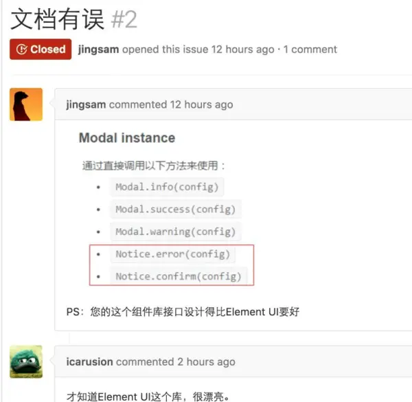 在 2016 年 9 月 29 日,一个希望我们参考 iView 修改文档的声音传来,我们注意到了 iView 这个同类型的组件库,当时作者是这么说的(图中的 jingsam 后来成为了 iView 的贡献者之一):