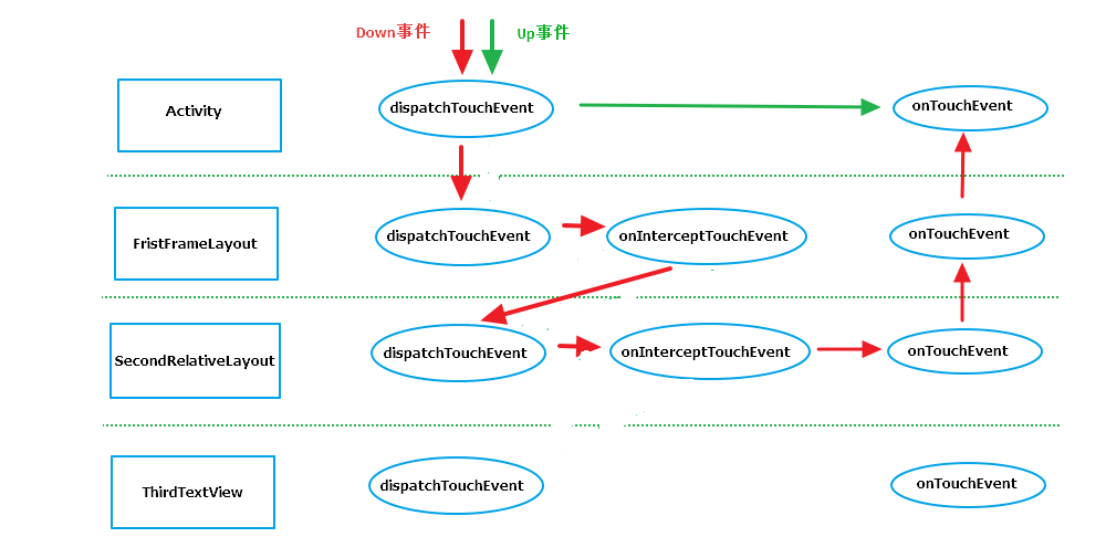 如果View一旦开始处理事件,如果它不消费ACTION_DOWN事件,那么同一个事件序列的其他事件也不会再交给它,并且重新交给它的父元素去处理。例如红线的down事件流向。