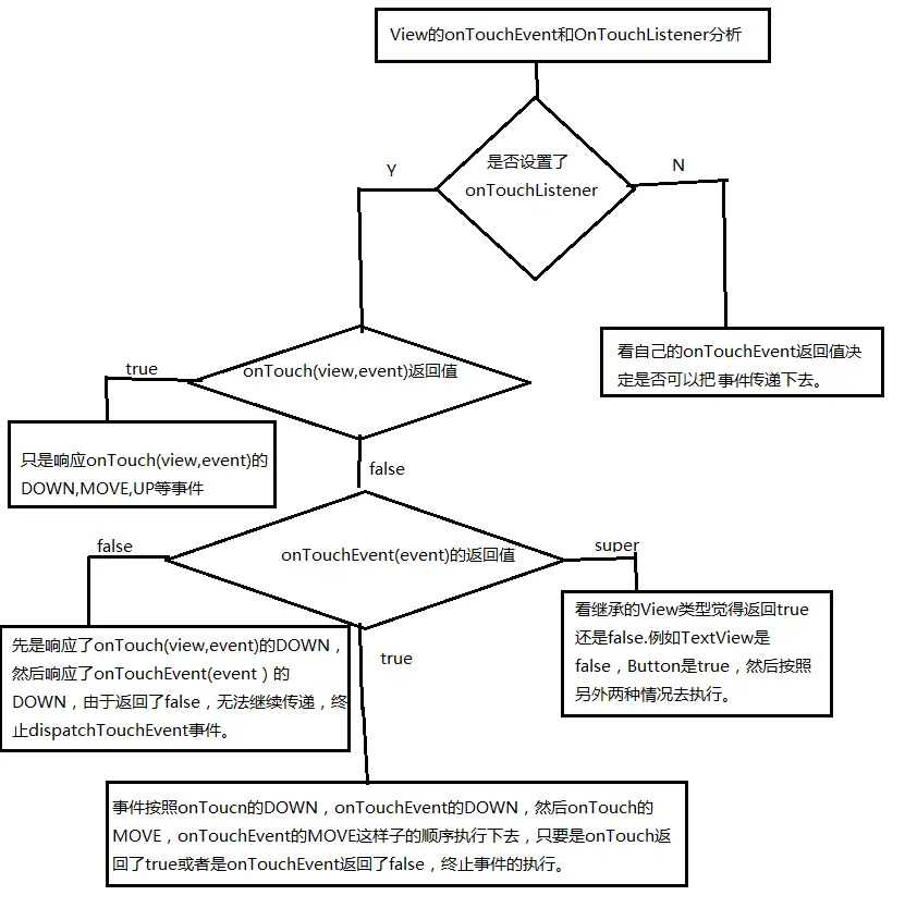 - 在View没有设置onTouchListener的时候,会执行onTouchEvent(event)方法,会执行那几次,需要看返回值。(DOWN,MOVE,UP)的时候的返回值,在返回了false之后不会再执行之后的事件,只有DOWN是一定会执行的。DOWN返回了false之后就不在执行,对于其他的类型。当直接返回super.onTouchEvent(event)作为返回值的时候,需要看继承的View,比如TextView的就会在DOWN之后就返回了false,那么默认就是只会执行DOWN。对于Button而已却是返回了true,事件可以传递下去,所以MOVE和UP都可以执行。