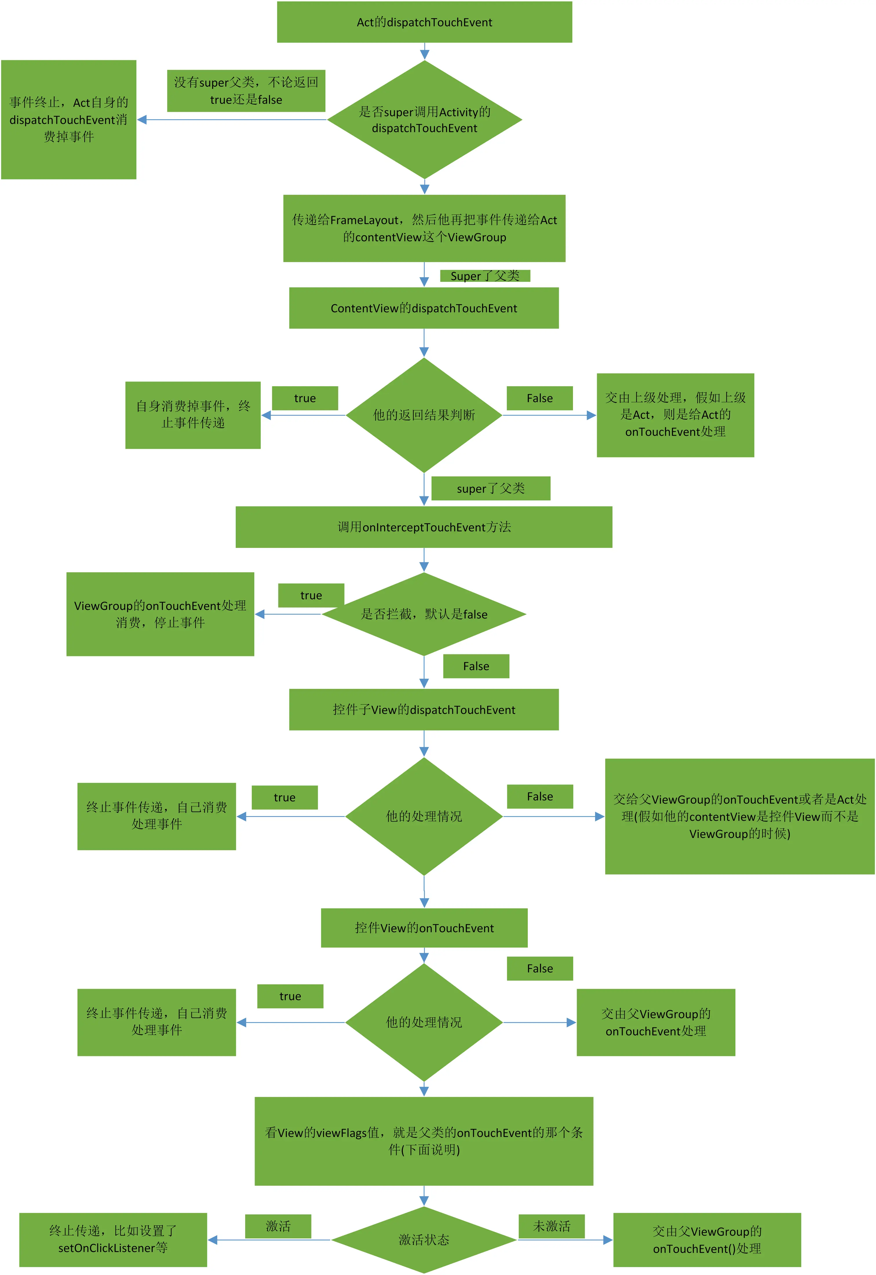- 只要是最底层的View Tree也是一直不处理,不感兴趣(不考虑激活),对于事件,那么这个事件就会一直往回传,传递给父ViewGroup的onTouchEvent,直到最顶级的Activity的onTouchEvent事件中。