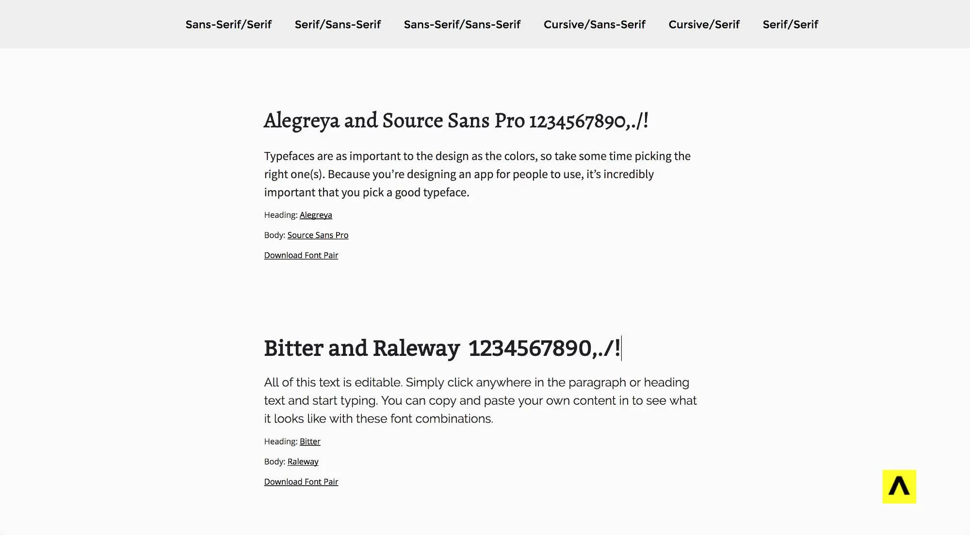 如果你喜欢使用多种字体,比如说标题一种,内容一种,你应试研究一下 Font Pair。他们做了大量的工作来展示两种不同字体在同一终端的不同表现。它使得挑选两种更好看搭配的字体变得非常简单。多说一句,这些都来源于谷歌字体,所以你不必担心找不到或者为其付费之类。