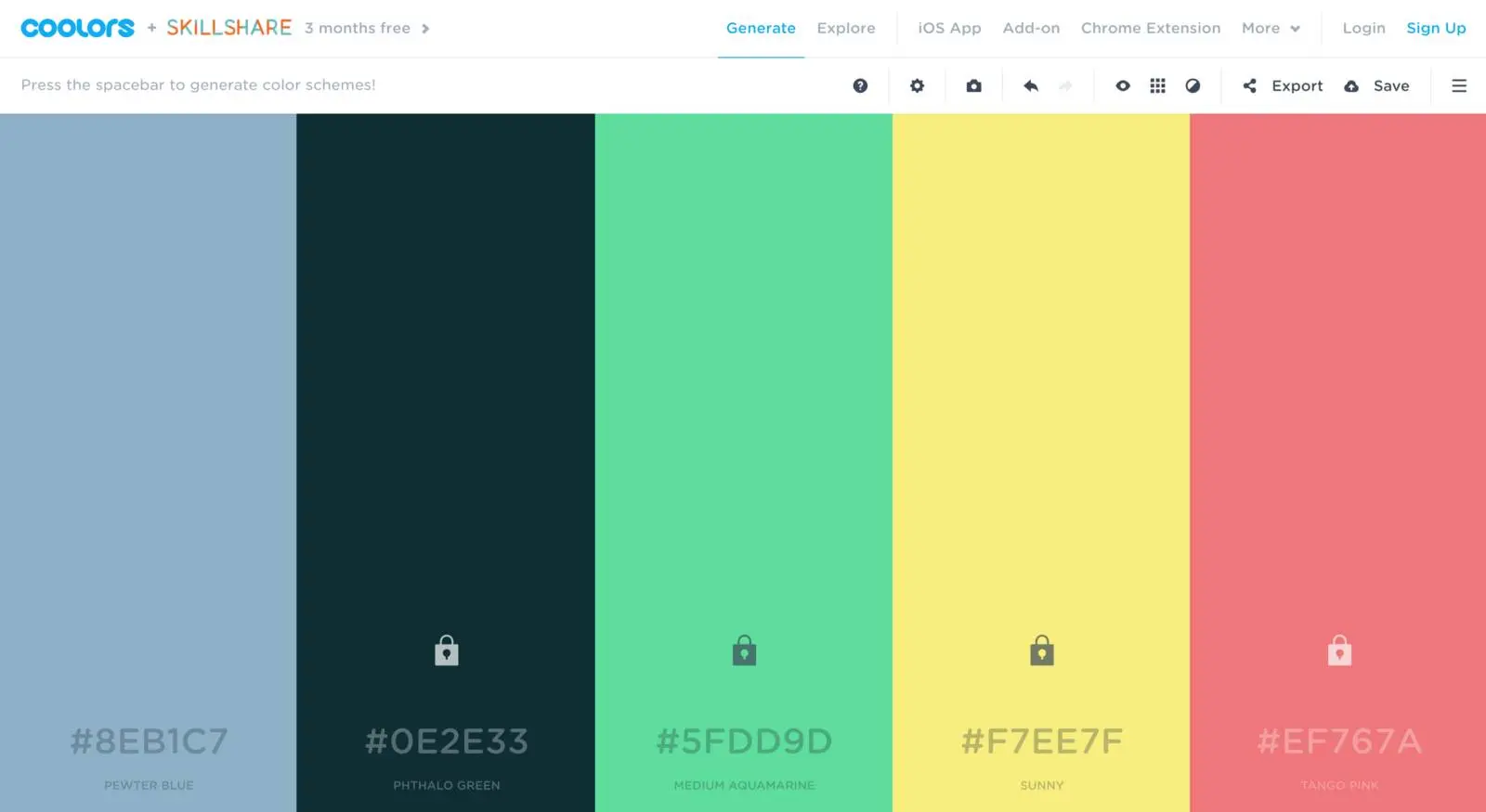 我使用的这个工具叫Coolors (作者是FabrizioBianchi)来帮助我生成一个颜色板。你只要敲一下空格它就会随机为你调出颜色。一旦你找到喜欢的颜色后,锁定它,然后生成你要的其它颜色。如果你的主品牌色已经确定了,你可以直接输入十六进制的颜色值,锁定那个颜色,然后敲空格来生成其它颜色。