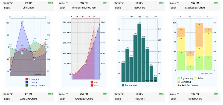 功能介绍:一个图表组件,通过 RN 代码对原生模块进行了一个包装。iOS上本质是调用的 Charts(v3.0.1) 这个库,Android上本质调用的是 MPAndroidChart(v3.0.1) 。可以实现的图表有:Bar(Stack,Group),Line,Scatter,Bubble,Pie,Radar,Combined,CandleStick 等。
