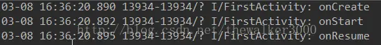 (2) Activity正常启动后,都会停在onResume()函数之后,想象一下,你打开Android手机的APP,正在看某个Activity上面显示的内容,如果这个Activity打印出了调试信息并且你能够看到,那么大概信息就会如下图所示