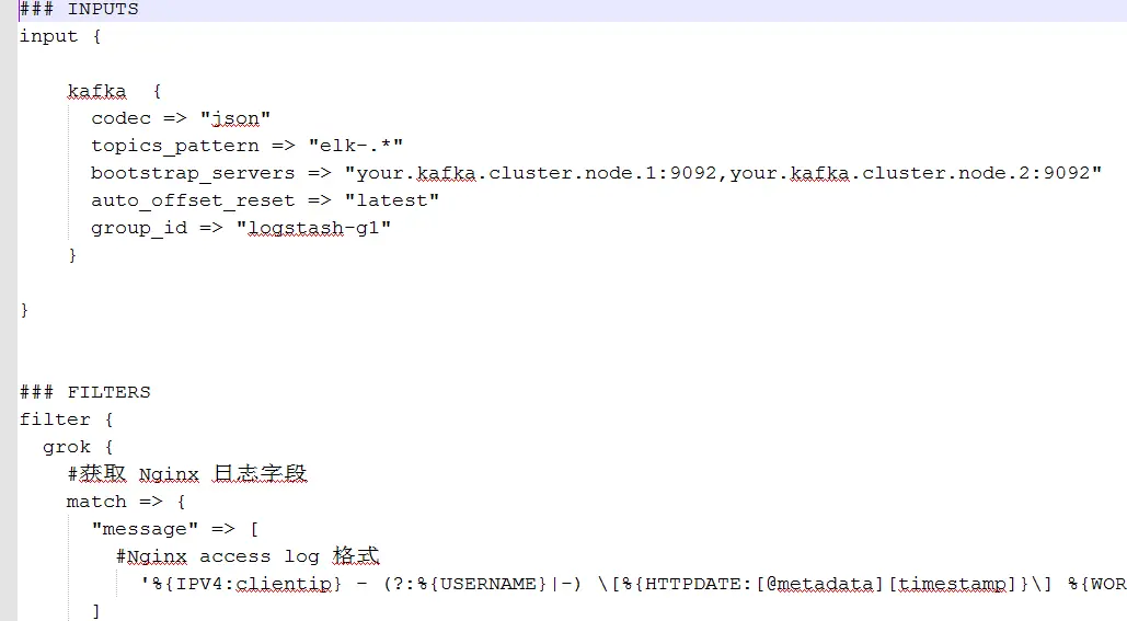 配置文件主要分为三大部分: Input / Filter / Output,对应收集、过滤、转发三个阶段。显然,Input 阶段只需要指定 Kafka 集群相关信息即可,Output 阶段只需要指定 Elasticsearch 服务器相关的信息即可,比较复杂的是 Filter 过滤阶段。