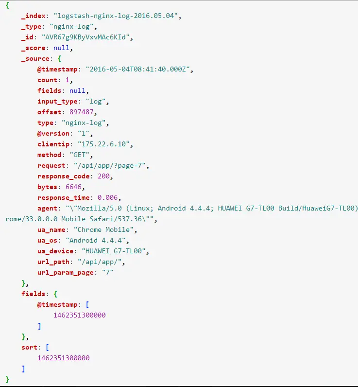 然后,mutate、ruby、useragent、date、kv 等插件配合使用,过滤并获取到感兴趣的字段,最后输出如下示例的 JOSN 对象: