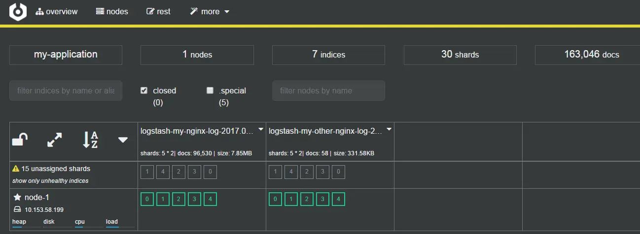 关闭备份,节省磁盘空间:"number_of_replicas": "0"