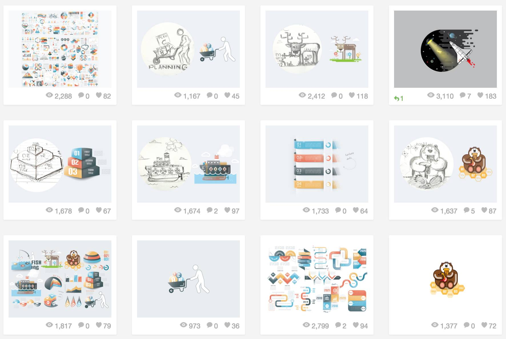 可能大家会好奇,作者的昵称为什么是“信息图表的天堂”?仔细观察发现,他在dribbble上的早期作品大部分是信息图表设计,可能与职业有关,推测他应该是位图表设计师。