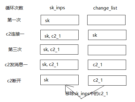 change_list, keep_list, error_list = select.select(sk_inps, [], sk_inps, 1)中,select.select()会自动监控起参数的内容, 当第一个参数中的对象发生变化时候会将该对象加到change_list中, 该次循环结束时change_list便会自动清空. 第一个参数中的变化对于sk对象, 这里只有客户端连接sk对象或者与sk对象断开两种情况 - 接着我们遍历change_lis中的内容, 当有客户端连接时候, 如图所见, chang_list中只有sk对象, 此时我们将客户端的连接conn加入到sk_inps中, 让select下次循环时候也监控conn对象的变化