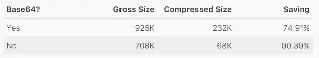 普通 CSS 文件有90%的压缩率,加入 Base64 后的 CSS 文件压缩率降到了74%,压缩后体积从68K增加到232K。