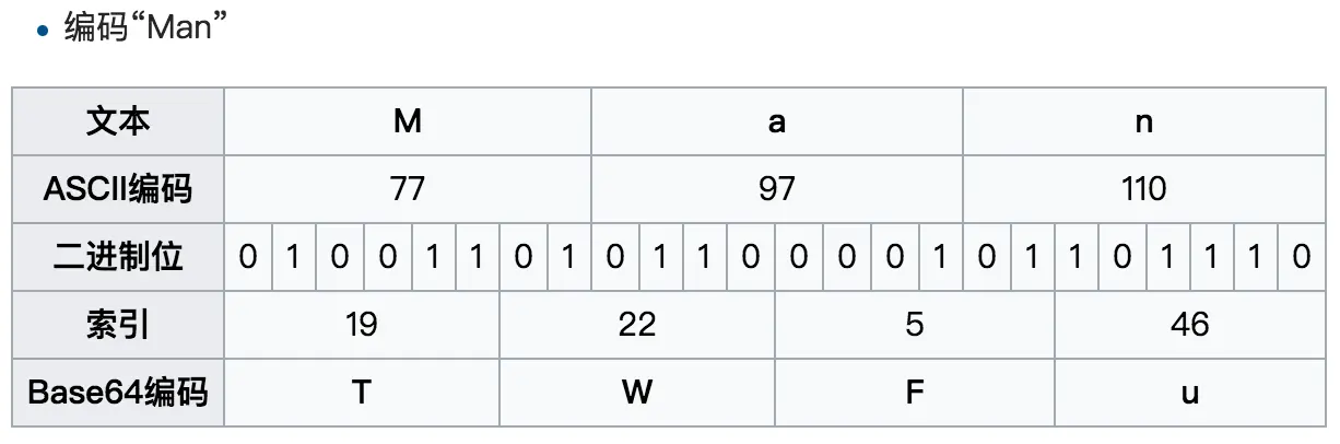 以下是“MAN”这个单词对应的二进制位和 base64 编码。