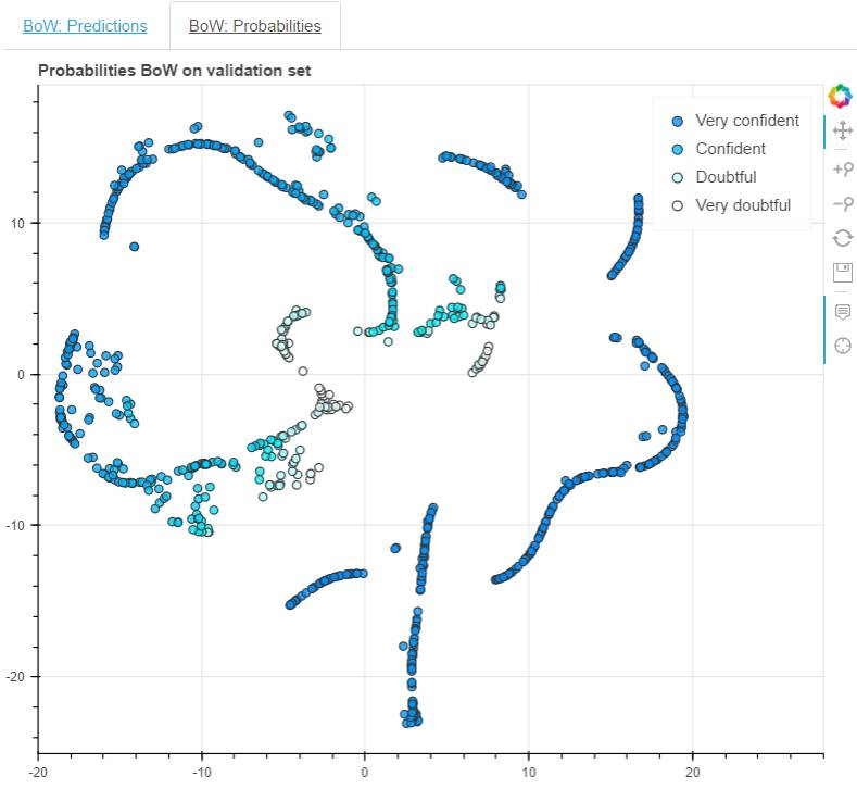 上面两张图是原文中可交互的图示的截图。在原交互图中,你可以将光标移动、缩放和悬停在数据点上来查看这些数据点的信息。在图中,你可以看到在词袋(BoW)中的最后一个隐藏层。当悬停在任何数据点上时,你可以看到表示该数据点的句子。句子的颜色取决于其标签(label)。