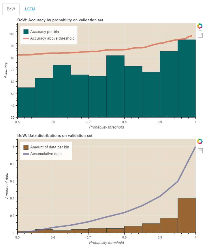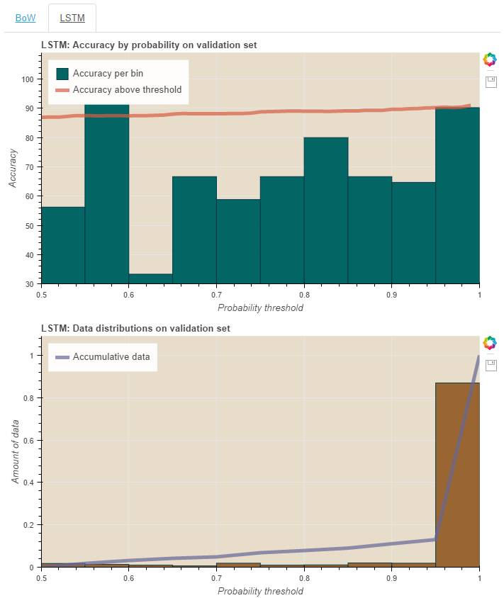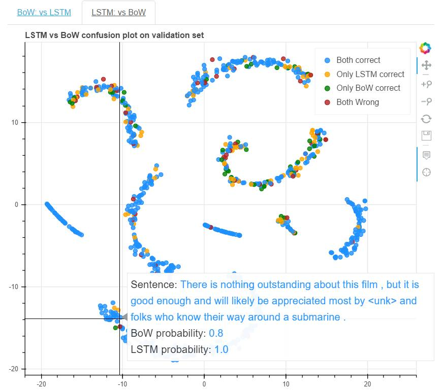 从对比图中,我们发现当 BoW 是正确的,并遭受怀疑时,我们很容易判决出来。然而,当 LSTM 可能是对或错时,BoW 与 LSTM 之间并没有明确的关系。