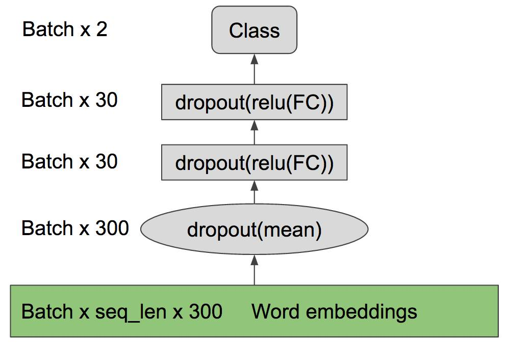 下面的绿色框表示词嵌入,使用 GloVe 进行了初始化,然后是取词的平均(词袋)和带有 dropout 的 2 层 MLP。