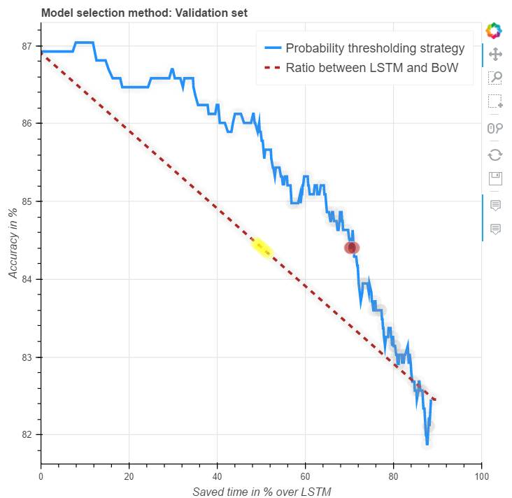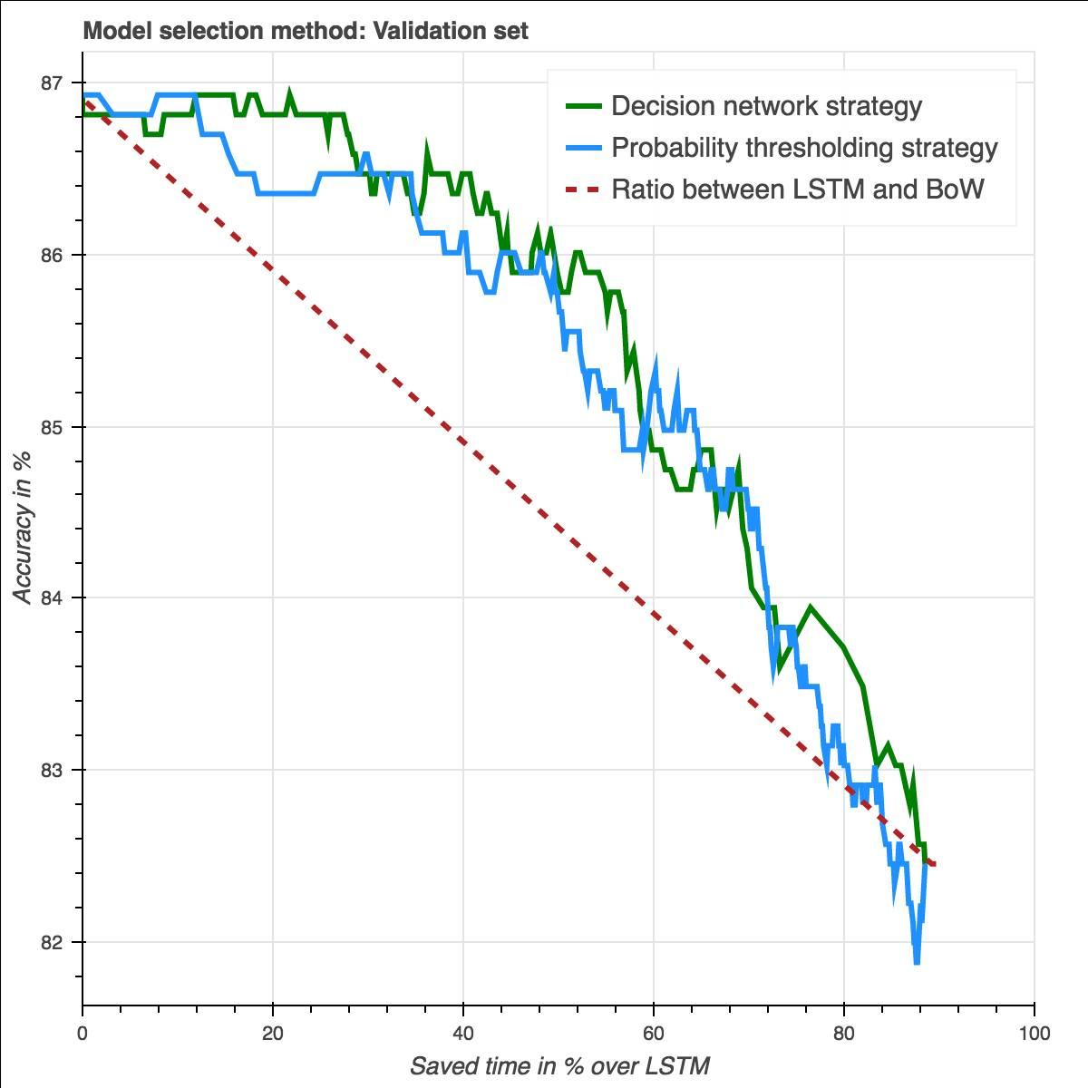 上图是验证集上的结果,其比较了 BoW、LSTM(红线)和概率阀值策略(蓝线)之间不同组合比率的精度和速度,最左侧的数据点对应于只使用 LSTM,最右边的只使用 BoW,中间的对应着使用两者的组合。蓝线代表着没有指导策略的 CBOW 和 LSTM 组合,红线描述了使用 BoW 概率作为策略指导哪个系统使用多大比例。注意最大的时间节省超过了 90%,因为其仅仅只使用了 BoW。有趣的是,我们发现使用 BoW 阀值要显著优于没有使用指导策略(guided strategy)的情况。