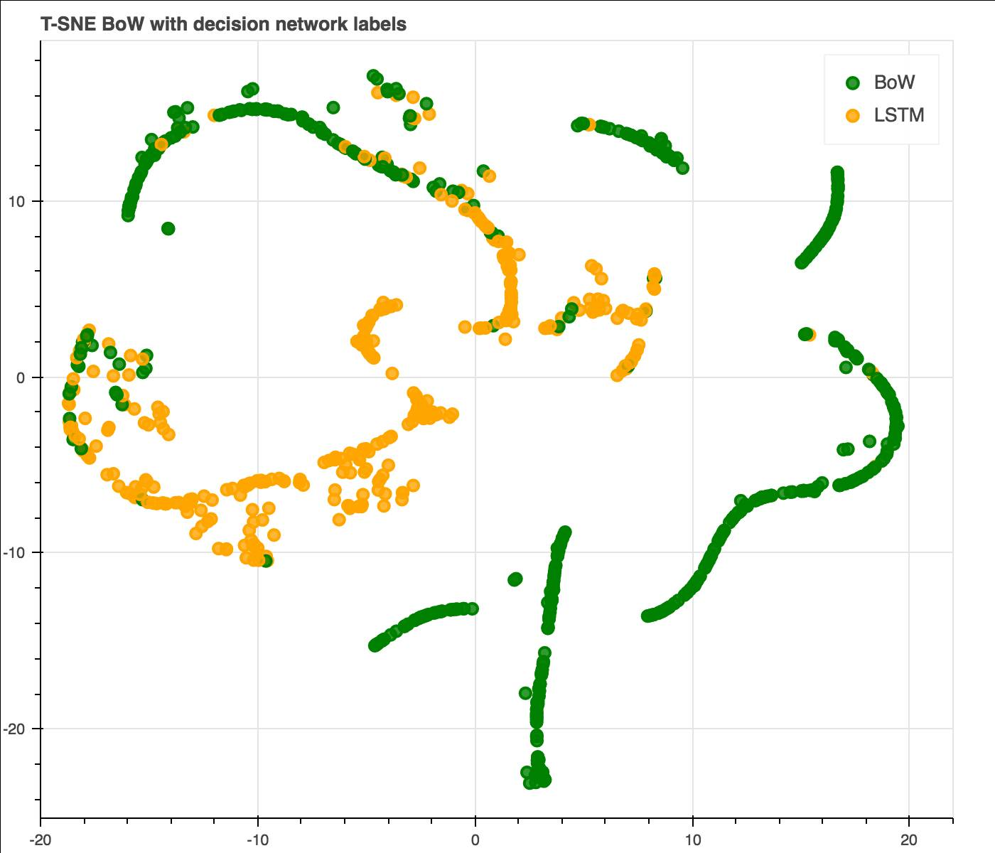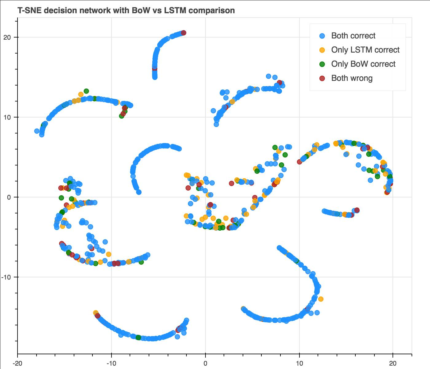 看起来决策网络能够从词袋的隐藏状态中拾取聚类。然而,它似乎不能理解何时 LSTM 可能是错误的(将黄色和红色聚类分开)。