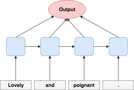 在每一个时间步骤(从左到右),一个输入(比如一个词)被馈送入 RNN(灰色框),并整合之前的内部记忆(蓝色框)。然后该 RNN 执行一些计算,得到新的内部记忆(蓝色框),该记忆表示了所有之前见过的单元(如,所有之前的词)。该 RNN 现在应该已经包含了一个句子层面的信息,让其可以更好地预测一个句子是积极的还是消极的(红色框)。