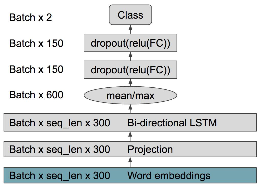 下面的蓝绿色框表示词嵌入,使用 GloVe 进行了初始化。在整个词嵌入中没有跟踪梯度。我们使用了一个带有 LSTM 单元的双向 RNN,使用的方式类似于词袋,我们使用了该 RNN 隐藏状态来提取均值和最大值,之后是一个带 dropout 的 2 层 MLP。