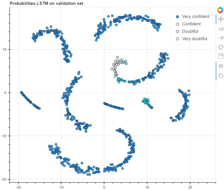 注意:这有多近似词袋的概率截止(probability cutoff)。让我们看看决策网络最后一个隐藏层的 T-SNE 是否能够真的聚集一些关于 LSTM 什么时候正确或错误的信息。