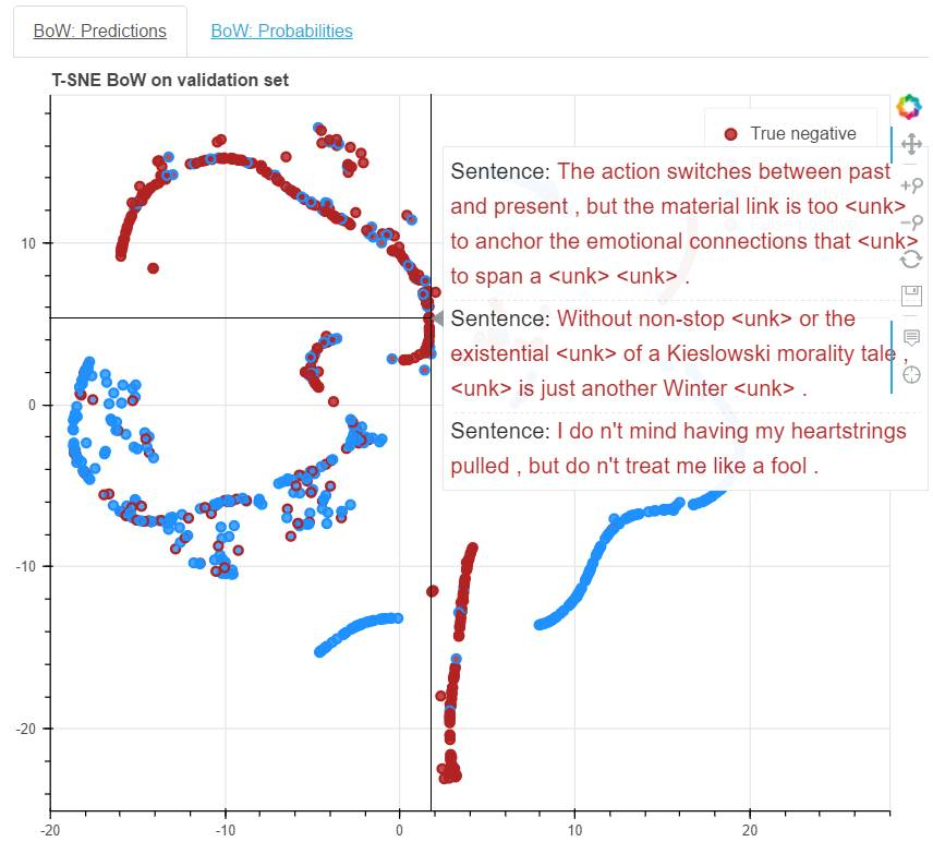 Predictions 标签页:该模型的系统预测与实际标签的比较。数据点的中心表示其预测(蓝色表示积极,红色表示消极),周围的线表示实际的标签。让我们可以了解系统什么时候是正确的,什么时候是错误的。