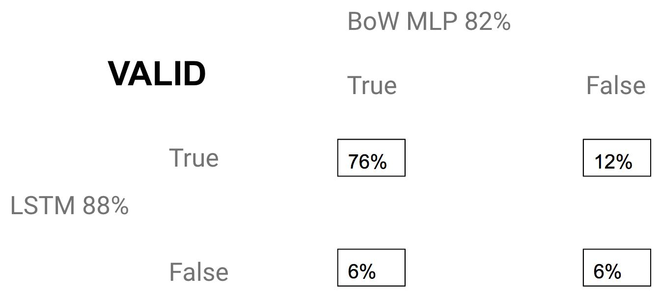 事实上,结果证明这种情况只适用于 12% 的句子,而 6% 的句子中,词袋和 LSTM 都错了。在这种情况下,我们没有理由再运行 LSTM,而只使用词袋以节省时间。