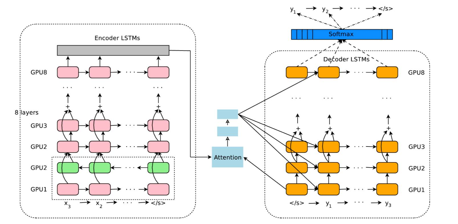 都表示带有 LSTM 单元的循环神经网络。它们也应用了一些权衡的技巧,比如跳过 LSTM 层之间的连接和一种被称为注意(attention)的方法。另外要注意绿色的 LSTM 指向了相反的方向。当与一个普通的 LSTM 结合时,这被称为双向 LSTM(bidirectional LSTM),因为其可以在数据序列的两个方向上都获取信息。更多信息可参阅 Stephen Merity 的博客(即机器之心文章《深度 | 逐层剖析,谷歌机器翻译突破背后的神经网络架构是怎样的?》)(来源:Wu et al., 2016)。